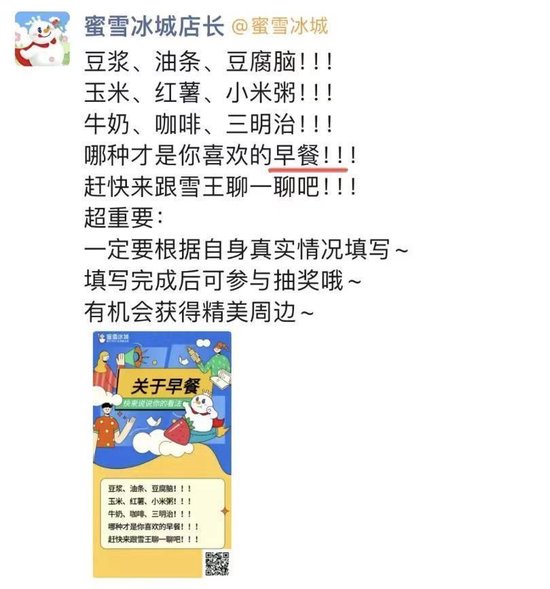 蜜雪冰城要开始卷早餐了?近日,蜜雪冰城企业号发布了一条消息,让大家聊一聊“哪个是你最喜欢的早餐!”