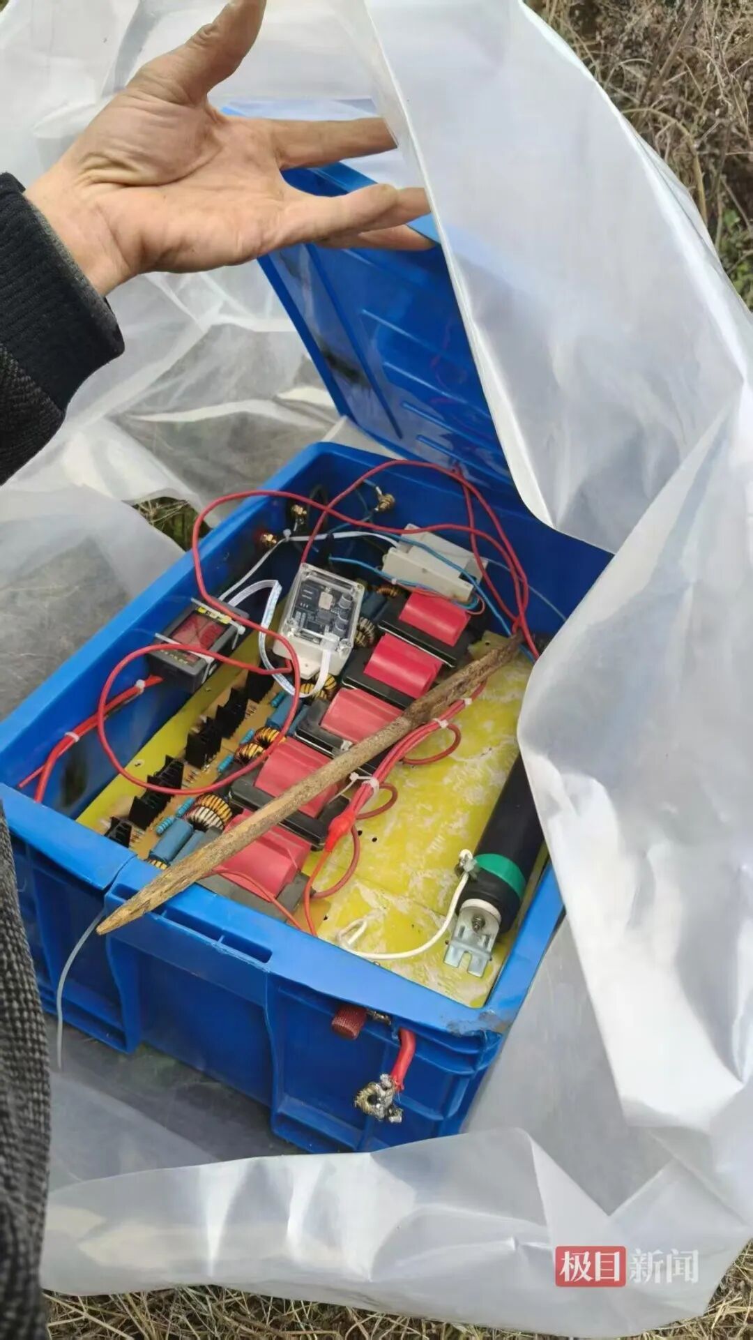 兰先生称,他们当时发现的非法猎捕装置被白色塑料膜盖住,有一白一蓝两个箱子,白色的是12伏电瓶,蓝色的是逆变变压器,设备可以输出高压电。当晚发现箱子后大家不敢靠近,第二天清晨天亮后,他们才发现电瓶上的正负极夹子已经被取下。大家推测,事发后有人在他们赶到现场前,取下了电线夹子以防触电。
